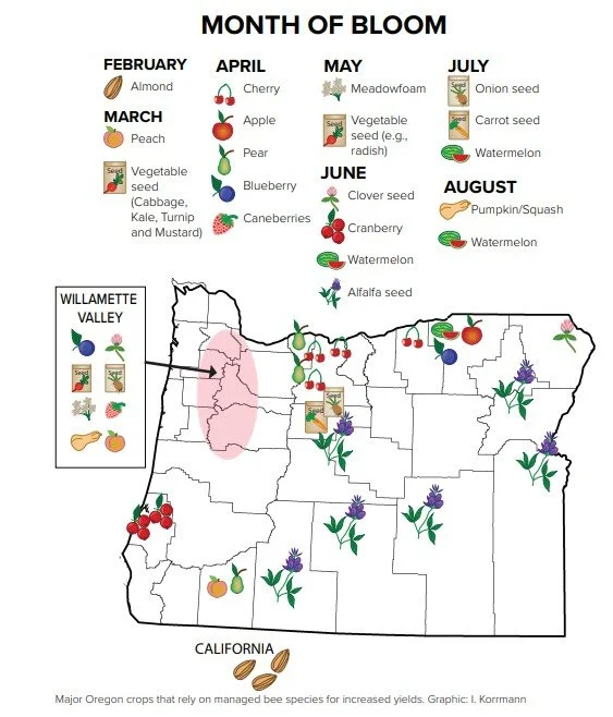 Oregon beekeepers play a direct role in ensuring pollinators remain a dynamic part of Oregon’s unique specialty crop sector. The honey bee is the most recognizable bee species in the state, and our state’s 80,000 colonies produce an abundance of products such as honey, wax, propolis, and pollen. Moreover, our beekeepers are uniquely invested in the success of crops grown in the state, with over 75% of their income coming from rental fees paid by growers from over a dozen different crops. These rentals are strongly connected with the competitiveness of some of the state’s most delicious crops, including Columbia Gorge cherries and pears, Hermiston watermelons, Willamette Valley blueberries and caneberries, and south coast cranberries. Honey bees also play a key role in boosting yields of seed crops, notably Willamette Valley vegetable and clover seed, and central Oregon hybrid carrot and onion seed. The seeds from these crops are planted throughout the US and worldwide.
