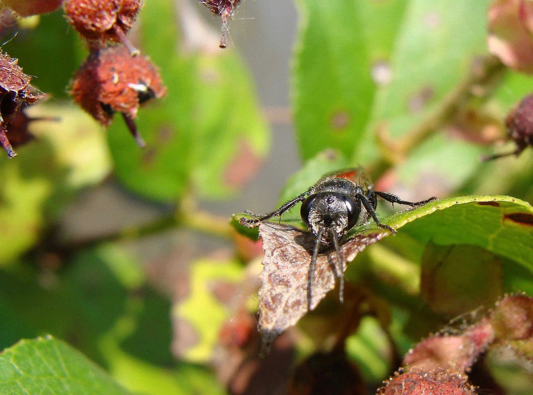 A: Its Osmia cornifrons. Its not from here. Michael O'Loughlin did a little digging and found out the following: "According the USDA Agricultural Research Service's ROBO database, Osmia cornifrons was purposefully released in 1984 in three counties - Multnomah, Columbia and Jackson." Michael adds: "It would be interesting to see how far they have spread from there and/or if they survived in these three counties. I know they are in Yamhill county now." Indeed!